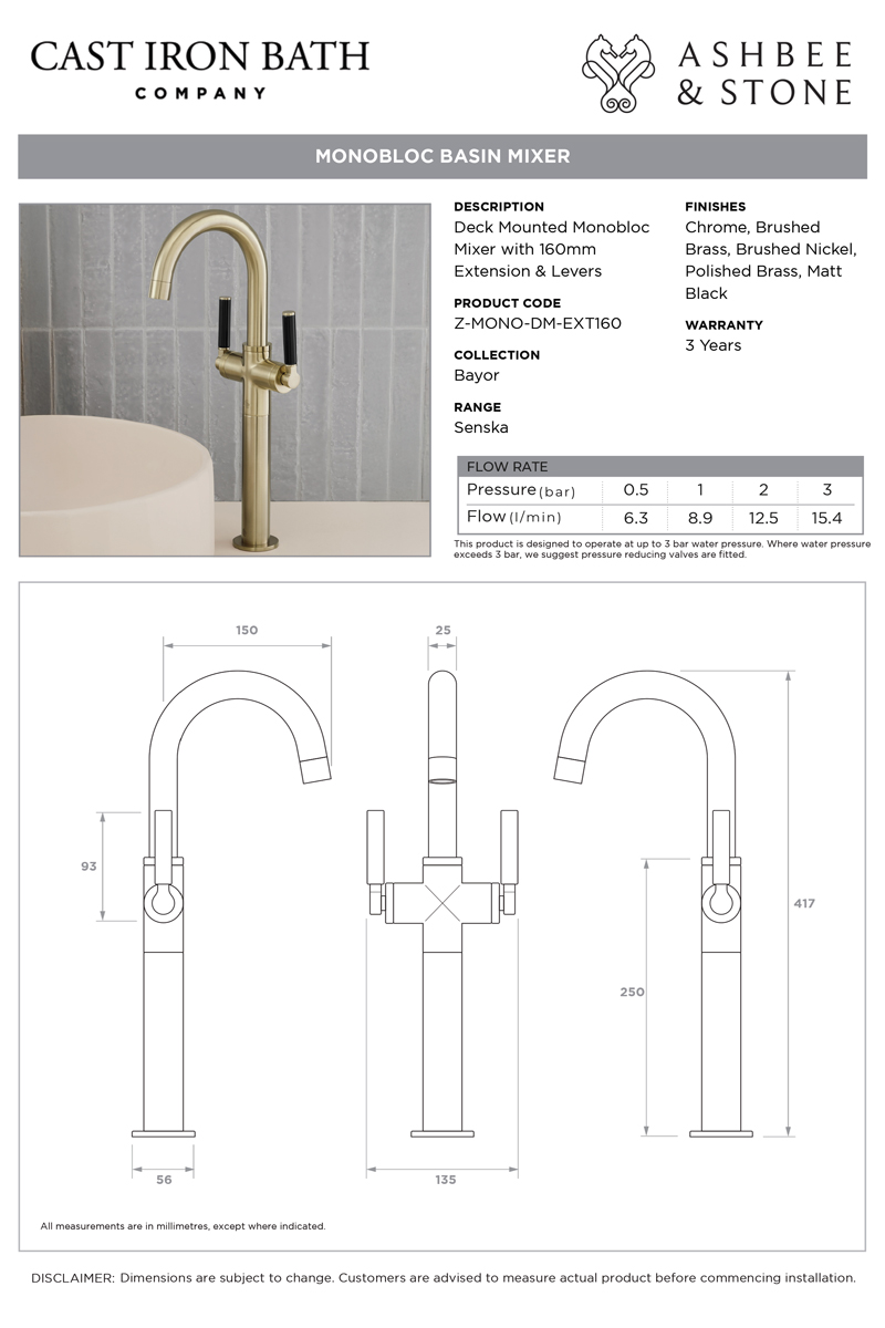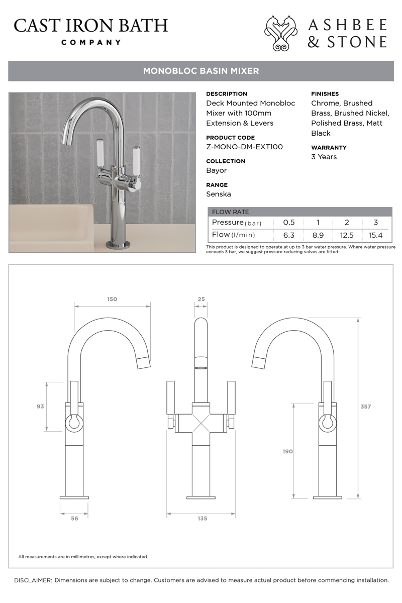 The Senska Monobloc Basin Mixer Tap is perfect for a stylish contemporary look in your bathroom. The tap is ideal for use with under counter basins but is also available with a choice of extension pieces to enable use with a large variety of deck mounted basin heights.