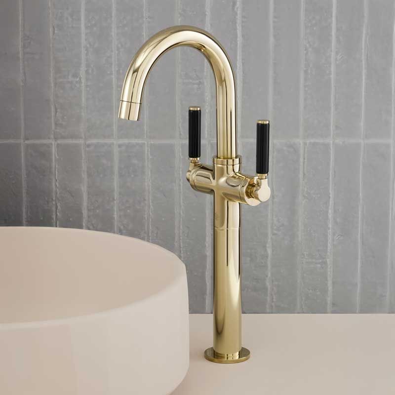 The deck mounted Senska monobloc basin mixer tap with black levers in polished brass.
