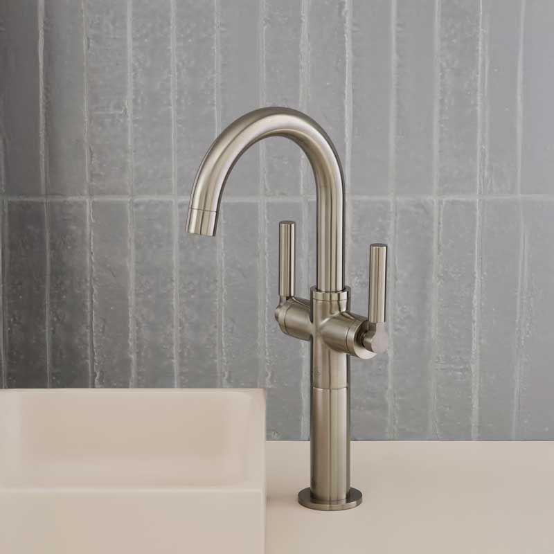 The deck mounted Senska monobloc basin mixer tap with metal levers in brushed nickel.