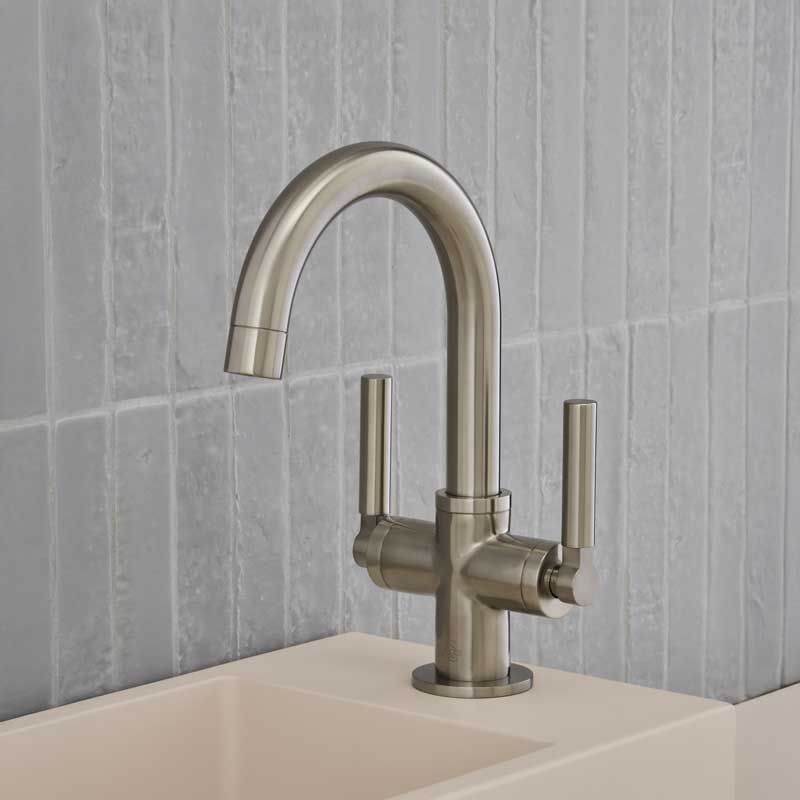 The tap shown here is without any exension pieces added and it the deck mounted Senska monobloc basin mixer tap with metal levers in brushed nickel.