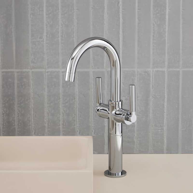 The deck mounted Senska monobloc basin mixer tap with metal levers in chrome.