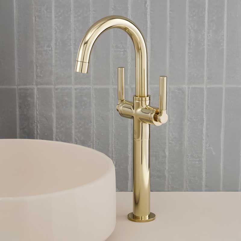 The deck mounted Senska monobloc basin mixer tap with metal levers in polished brass.