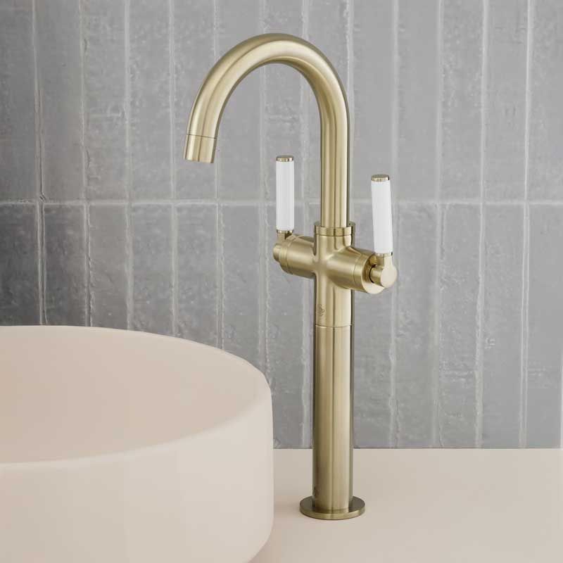 The deck mounted Senska monobloc basin mixer tap with white levers in brushed brass.