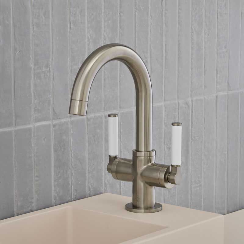 Senska Monobloc Basin Mixer - Deck Mounted - White Lever - Brushed Nickel