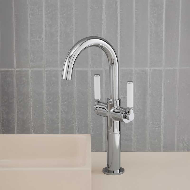The deck mounted Senska monobloc basin mixer tap with white levers in chrome.