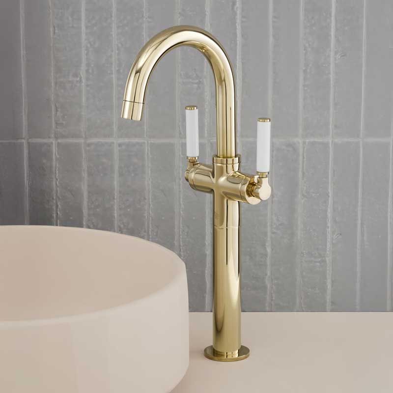 The deck mounted Senska monobloc basin mixer tap with white levers in polished brass.