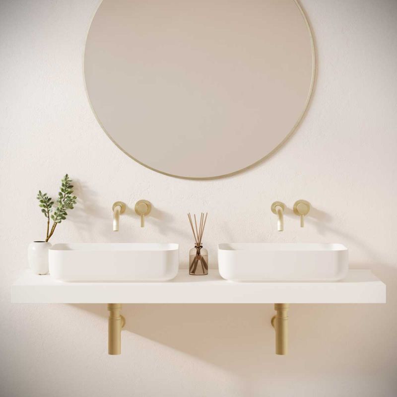 Elevate your bathroom with the Sigmar Stone Countertop Basins in White, with matching white Vasco Double shelf, made exclusively in RossaStone®-a durable, antibacterial, and UV-resistant stone composite. Designed by Ashbee and Stone, this bold, matte-finish basin offers modern style, superior functionality, and custom colour options for standout interiors.