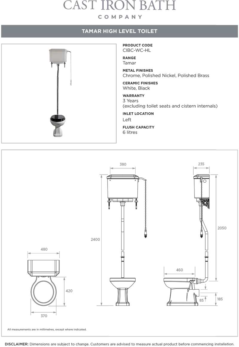 All of our toilets’ internal fittings are manufactured in the U.K.Whether you’ve chosen one of our close couple, low level, high level or back to wall toilets, be sure to purchase a Tamar toilet seat to ensure a perfect fit.The toilets’ fittings come in chrome and polished nickel options.** TOILET SEAT NOT INCLUDED **