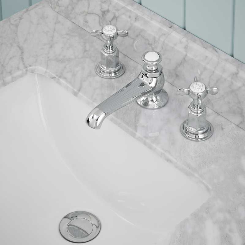 Each tap has a stylish cross-head and German engineered ceramic cartridges with hot and cold indicators. The central mixer spout has a pop-up waste button.