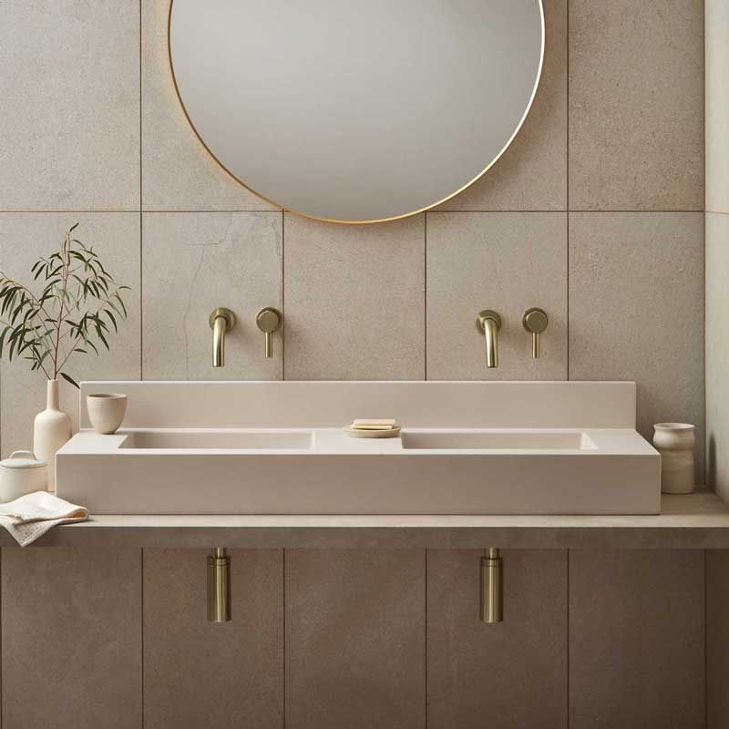 Inspired by the stylish clean lines of The Bauhaus, the Xanti double backplash basin can be wall hung or surface mounted. Available in a wide range of coloured pigments.