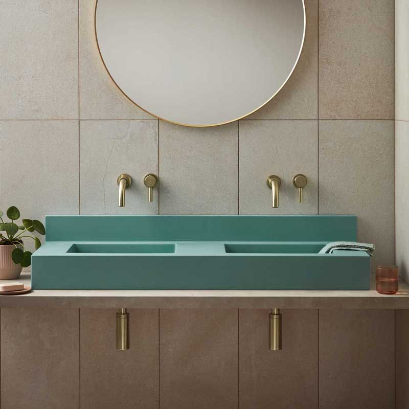 Inspired by the stylish clean lines of The Bauhaus, the Xanti double backplash basin can be wall hung or surface mounted. Available in a wide range of coloured pigments.