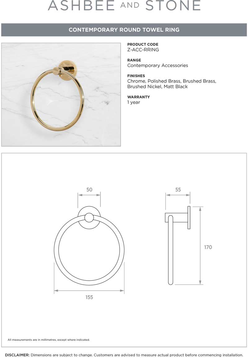 A refined expression of modern elegance, the Ashbee & Stone Contemporary Round Towel Ring is crafted from solid brass, offering timeless style and superior quality.